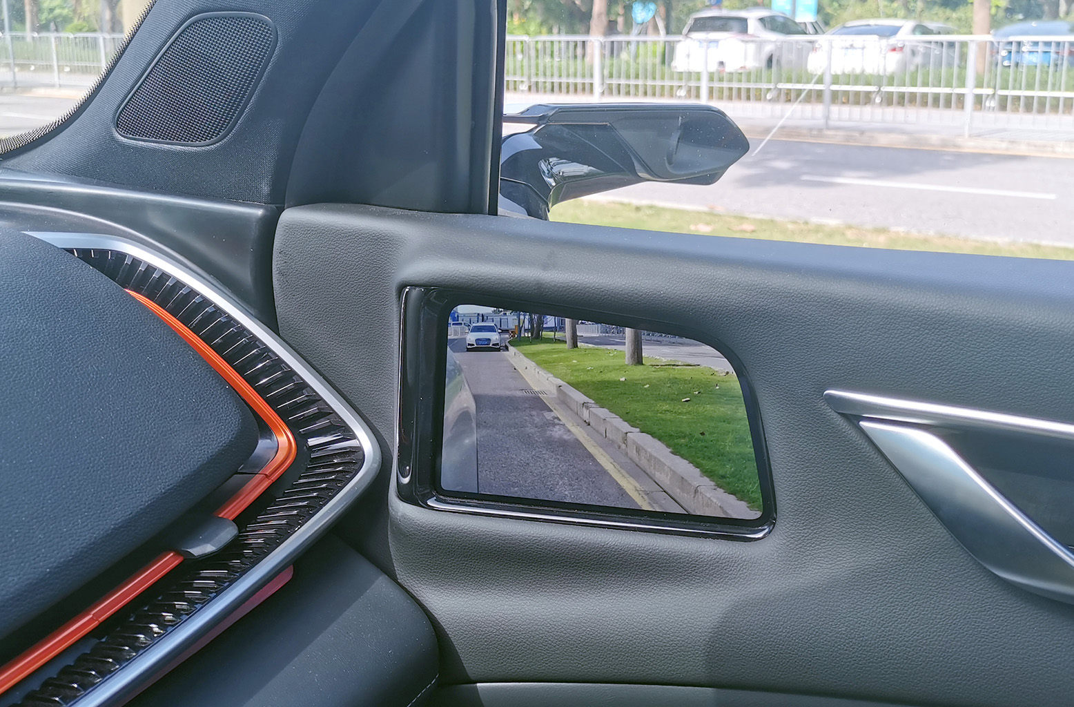 車規級OLED柔性屏貼合A柱設計,通過算法實現A柱“透明化、可視化”,不影響造型美觀與A柱強度情況下,完美解決A柱盲區問題。